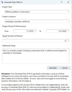 With Acumen 8.11, Deltek introduces Dela-Enabled Risk Discovery & Mitigation, an AI-powered enhancement designed to help project teams work faster and smarter. This new capability surfaces potential risks and generates context-specific mitigation strategies based on project type and location, simplifying one of the most time-consuming steps in risk planning. Teams can now focus on analysis and decision-making instead of manual data entry, accelerating their ability to respond to project uncertainty.